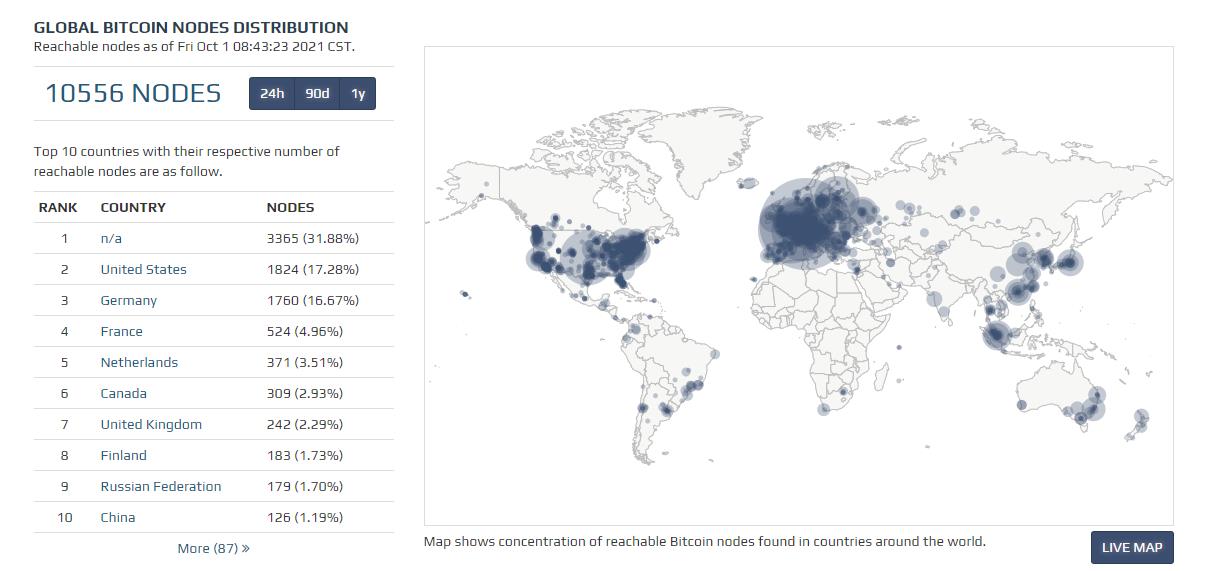 因此,比特币全节点客户端并不适用于普通用户,一般都是一些专业的矿工,组织或者机构在使用。根据bitnodes数据显示,全球比特币全节点客户端有10556个,主要分布在北美洲和欧洲。